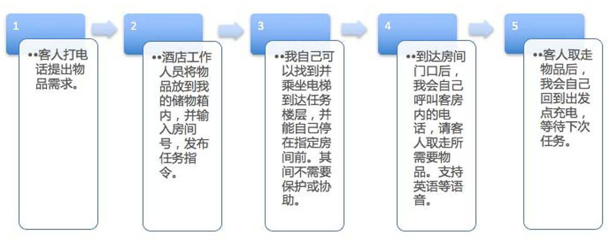 作為第一個真正實現(xiàn)酒店智能送物的機器人,也是稱職賓客服務(wù)員,可以自主將客人需要的物品安全快速送達。以下是潤的工作流程: