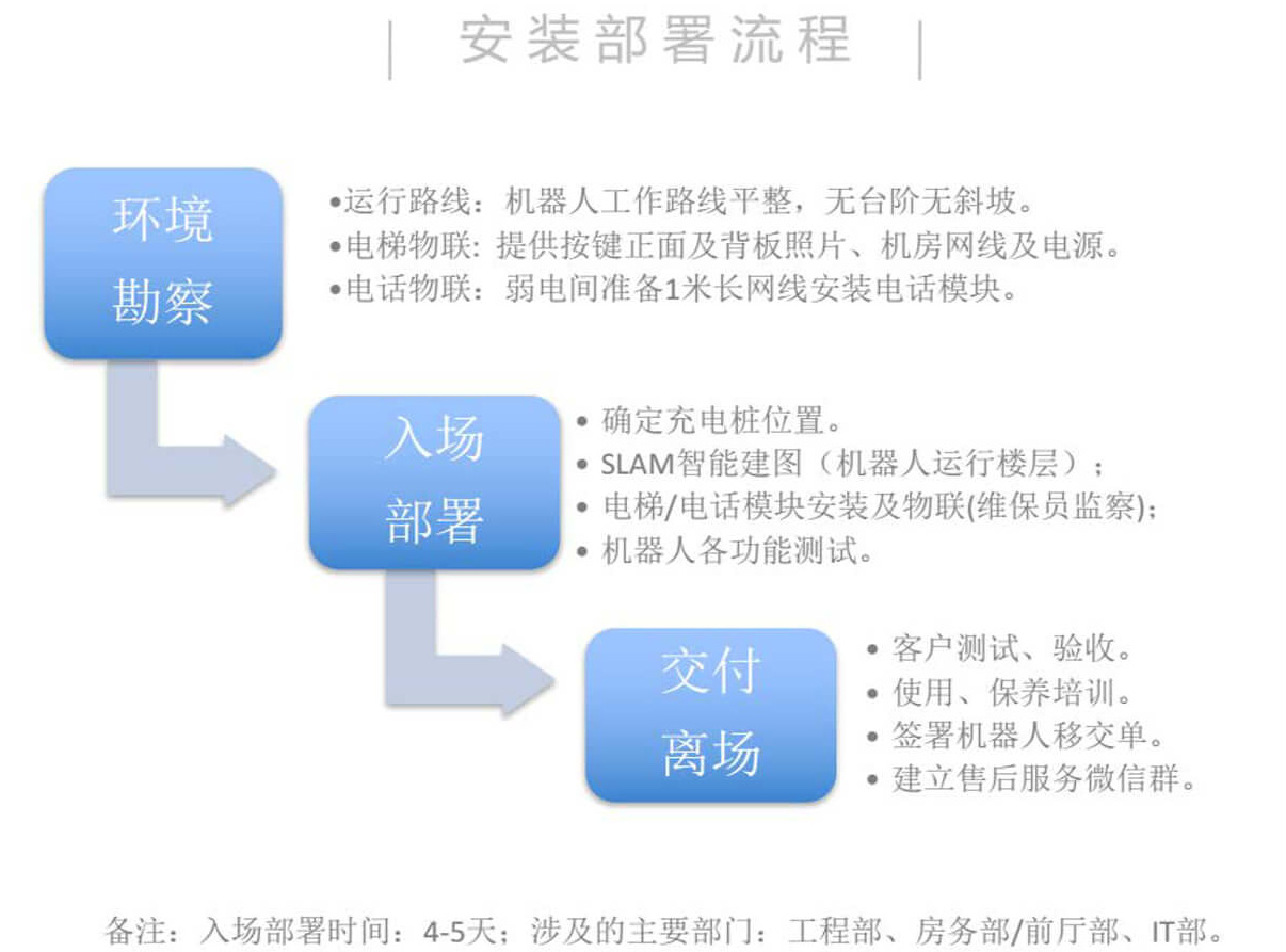 一般機器人的安裝和部署加上測試和對員工培訓,一般4-5天。具體安裝部署的流程如下:其中環(huán)境勘察這一步是遠程處理,對于一些特殊項目,公司也會根據(jù)酒店反饋的硬件情況安排工程師具體現(xiàn)場勘察。
